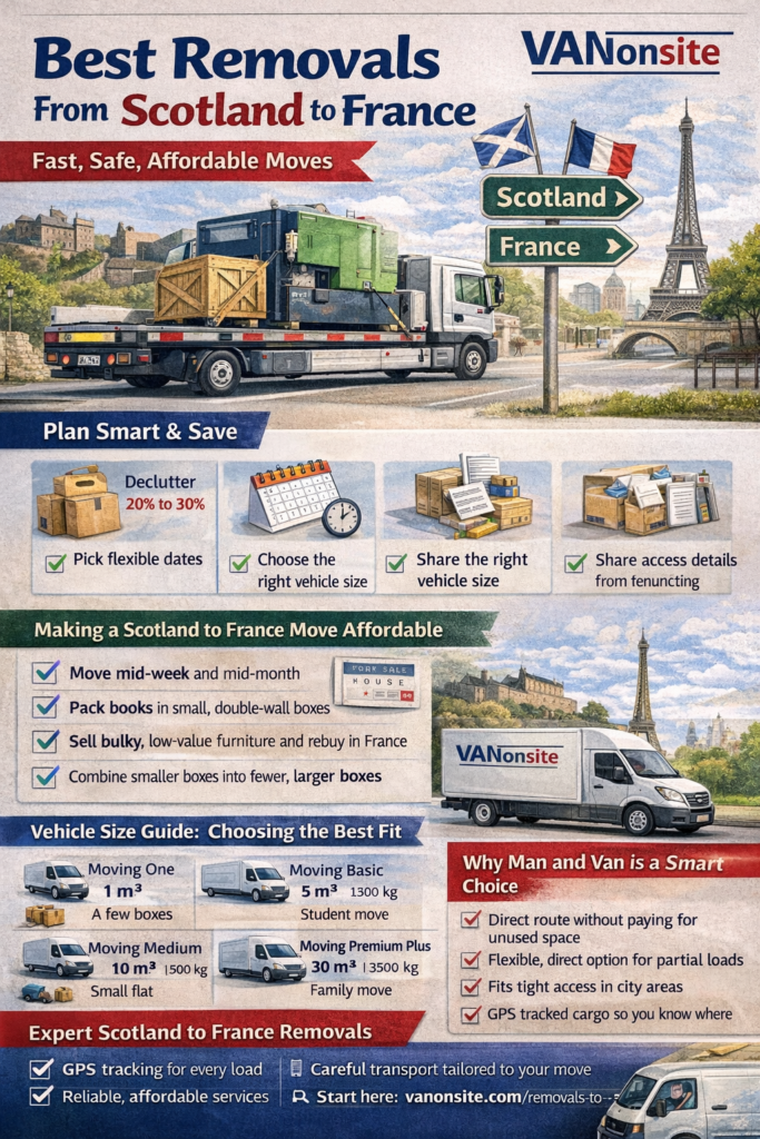 - The cheapest removals from Scotland to France usually come from flexibility: mid week slots, off peak weeks, and the right vehicle size.