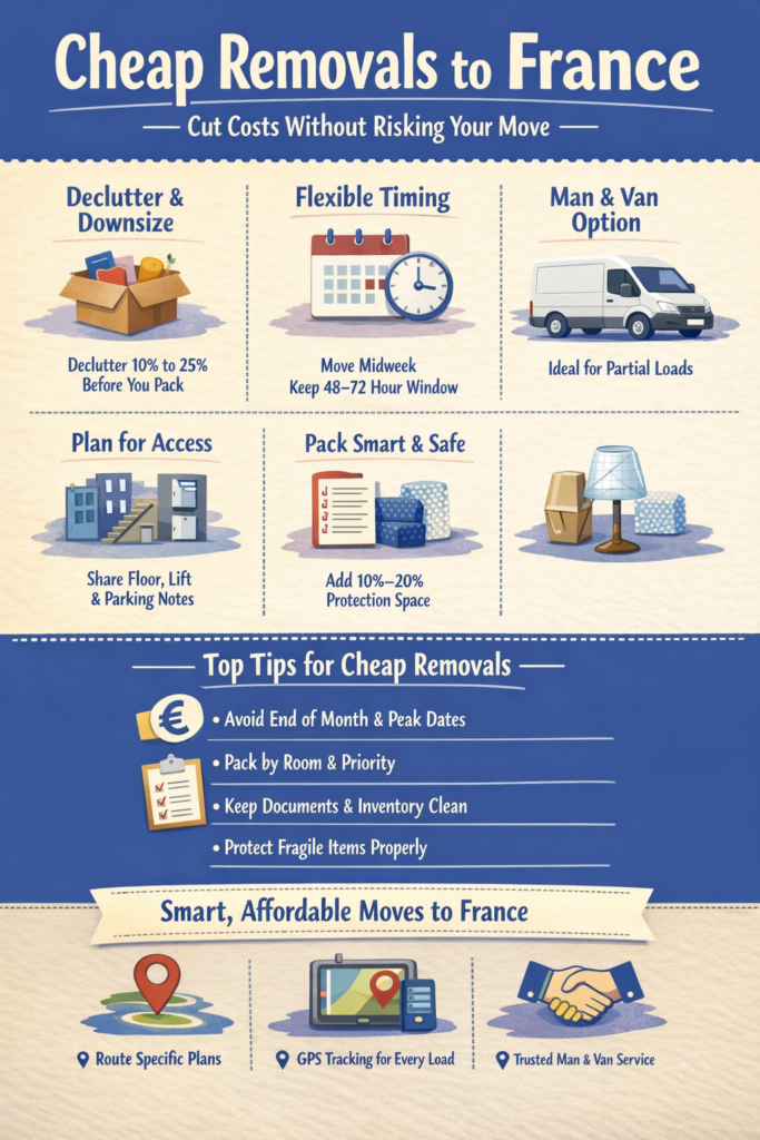 Keep a 48 to 72 hour flexibility window if you want truly cheap removals to France. Flexibility helps routing and avoids peak time pressure.