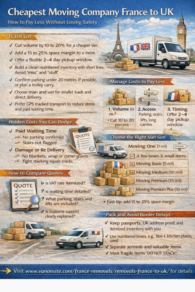 If you want the cheapest moving company France to UK, the goal is not the lowest quote. The goal is the lowest final cost after the move is delivered safely.