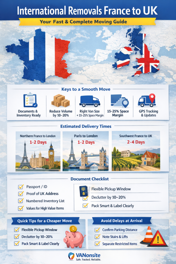 If you want the dedicated route page for international removals France to UK, start here: https://vanonsite.com/france-removals/removals-france-to-uk/