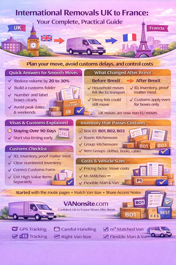 - After Brexit, international removals UK to France can involve customs, so paperwork matters.