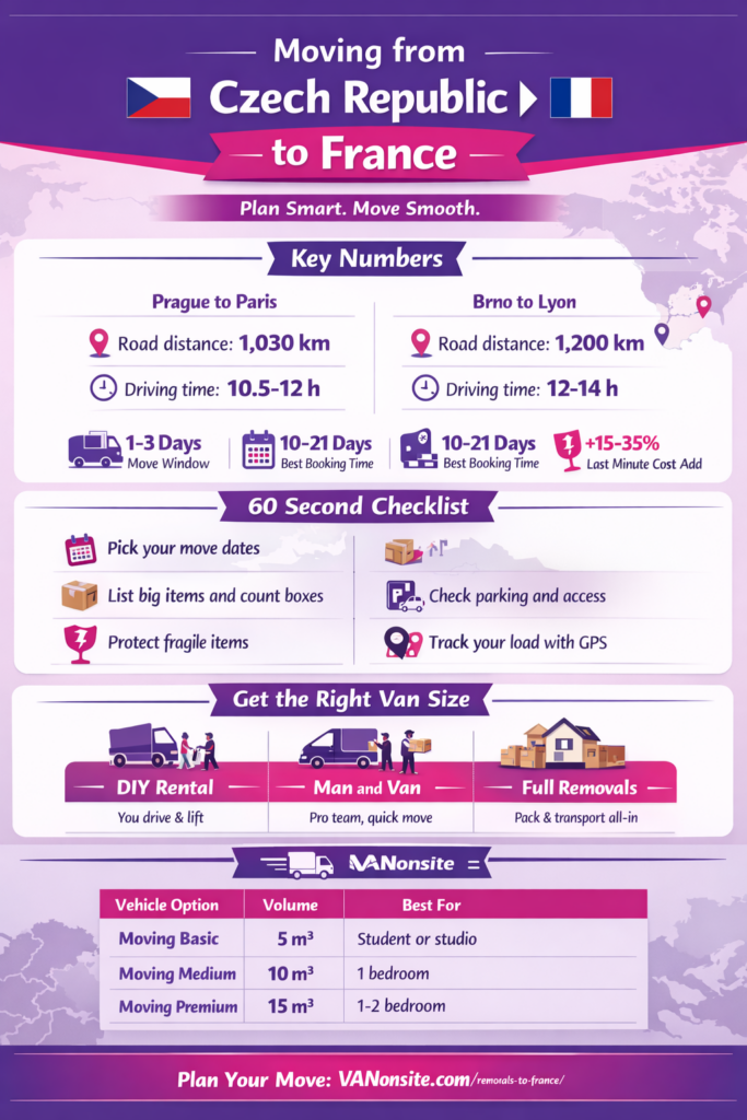Moving from Czech Republic to France is easiest when you treat it like a clean sequence. Get the van size right, lock in access, pack like you expect the road to shake everything, and keep your essentials with you.
