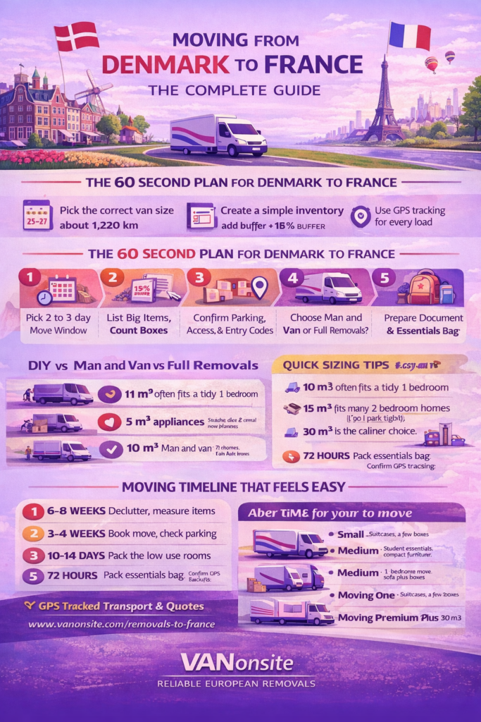 Moving from Denmark to France is easiest when you treat it like a short, well planned project. Start by choosing the right van size using real volume, not hope. Confirm access and parking early, because city logistics can add 60 to 120 minutes. Pack for long distance vibration, keep boxes under 20 kg, and carry your core documents with you, not in the load.