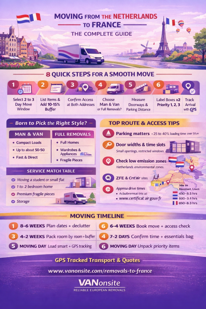 Moving from the Netherlands to France is easiest when you plan around three anchors: a realistic inventory with a 10 to 15% buffer, clear access details at both addresses, and the right service level. Choose man and van for a compact, direct move. Choose Home Removals when you want structure for stairs, wardrobes, appliances, and a full household. Confirm low emission rules early, label boxes on two sides, and keep an essentials bag for 48 hours. Then GPS tracked delivery does what it should do: turn a big day into a clean arrival.