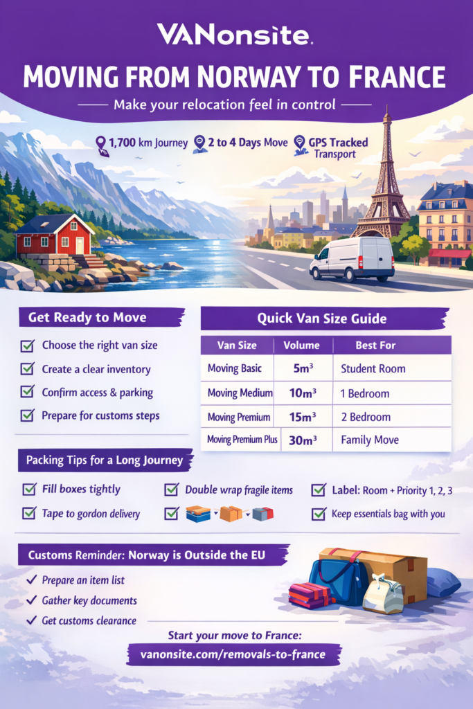 A small bonus that saves big stress: confirm access and parking in advance. On moving from Norway to France, bad access can easily add 60 to 120 minutes to the day.