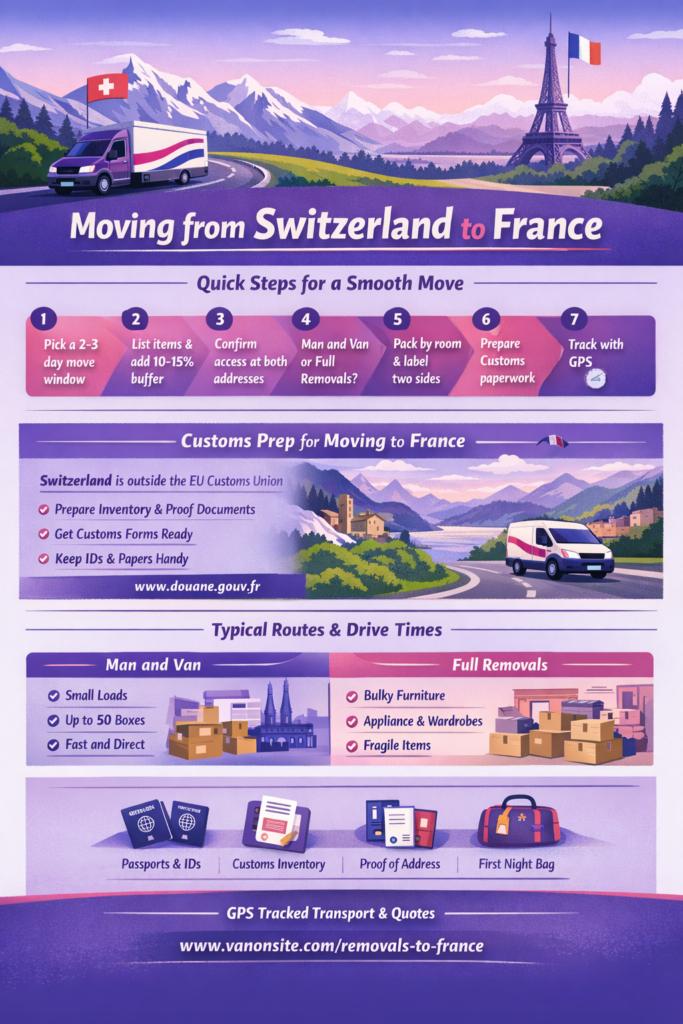 Costs for moving from Switzerland to France depend on distance, access, volume, and service level. The fastest way to control budget is to control volume and remove access friction.