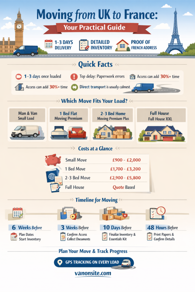 Most moving from UK to France relocations take 1 to 3 days once the van is loaded. The biggest variables are customs processing, route choice, and access at the French address. If your building has tight stairs or a long carry from the curb, handling time can increase by 30% to 60%.