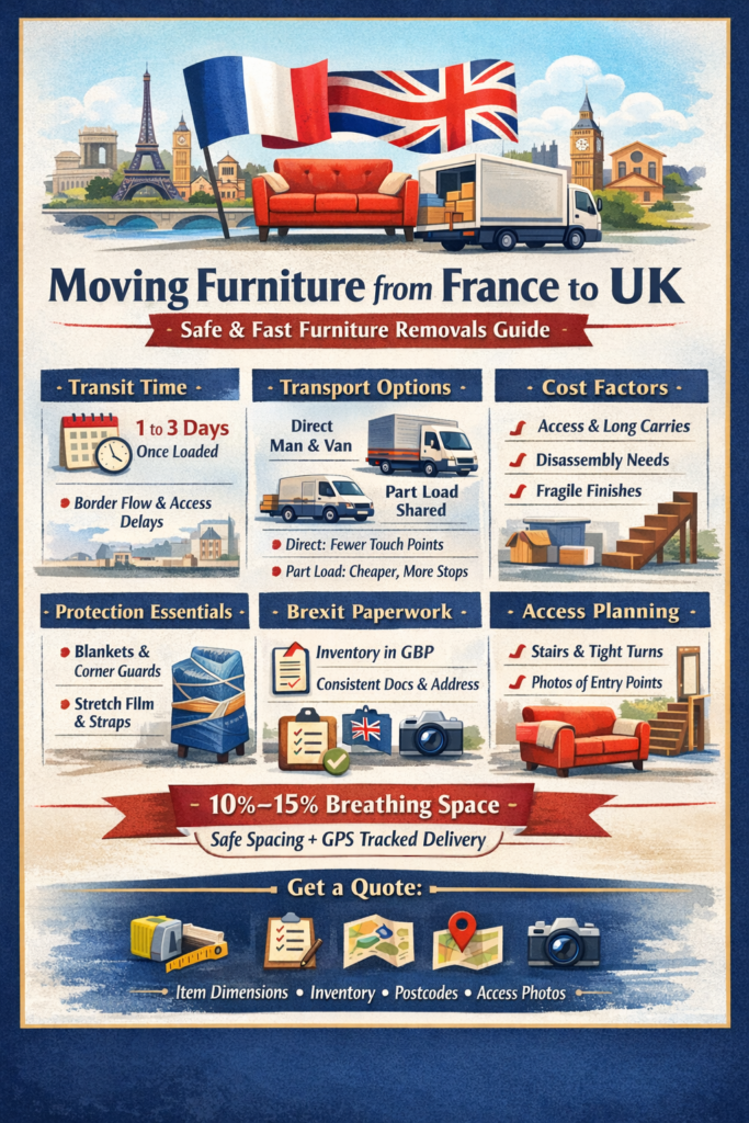 This guide is built to be direct, practical, and fast. It shows you how to plan moving furniture from France to UK without the usual regrets: scuffs on corners, pressure marks on upholstery, delivery windows that slide, and paperwork that turns into delays. You will also find a clear route through furniture removals from France to UK after Brexit, including what documents to prepare, how to build an inventory in GBP, and how to avoid the mistakes that slow border checks.