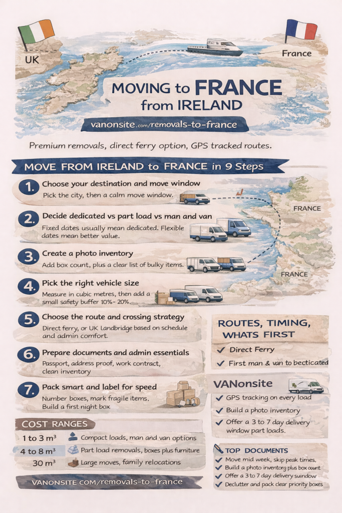 VANonsite supports moving to France from Ireland with premium handling, fast routing, and GPS tracking for every load. For an accurate quote, send your pickup and delivery postcodes, floor access details, your box count, and photos of bulky items. If you want the smoothest start, include your preferred date plus how flexible you can be.