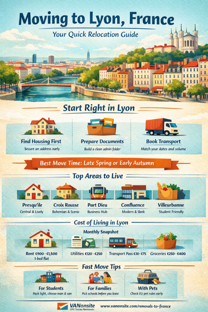 This guide is built for speed and certainty. You will get real numbers, a calm timeline, and the key admin steps for moving to Lyon France. When you are ready to move, VANonsite keeps it safe and fast with GPS tracking on every load, plus flexible options from man and van to full removals.