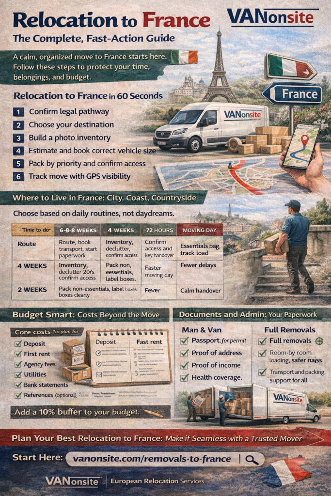 When you want speed, safety, and calm control, VANonsite supports relocation to France across Europe with GPS tracked loads and flexible services, from packing support to full home removals.