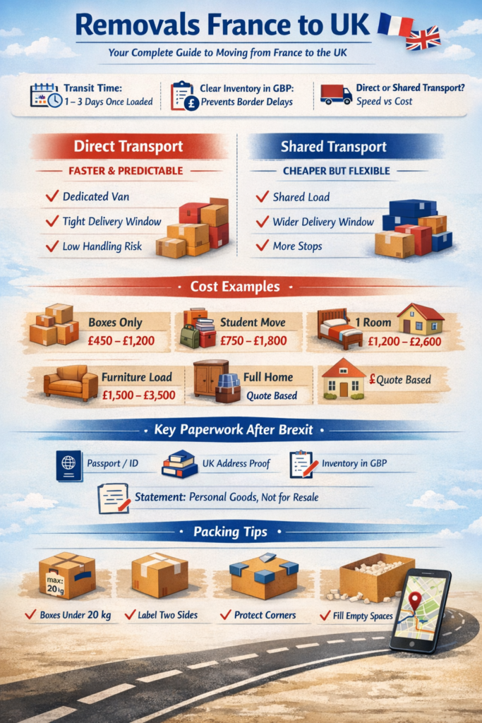If you are searching for removals France to UK, you want fast answers. How long will it take. What will it cost. What paperwork do you need after Brexit. Should you choose direct transport or a shared option. And how do you protect your belongings so they arrive in the same condition they left.