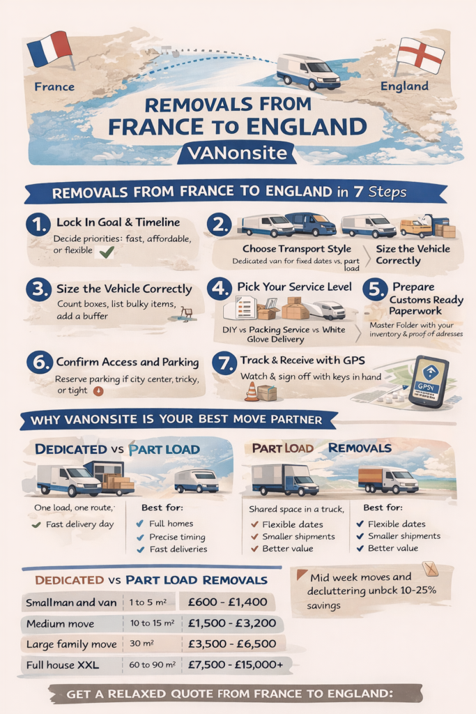 This guide covers paperwork after Brexit, cost drivers, transit times, and how to choose between dedicated transport and part load removals from France to England. If you are also planning the reverse route later, start here: https://vanonsite.com/removals-to-france/