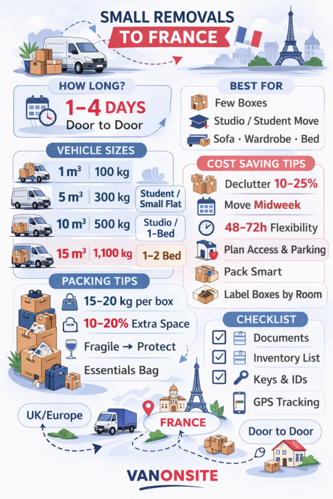 VANonsite is a strong fit for small removals to France when you want speed and calm, without cutting corners.