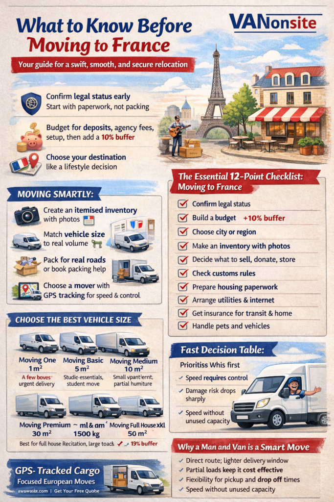 This guide gives you exactly that. You will learn what to know before moving to France before you spend a cent, before you tape your first box, and before you arrive tired and realise you missed one critical step. And if you want a smooth, flexible move across Europe, you will see where a trusted man and van service can be the smartest choice.