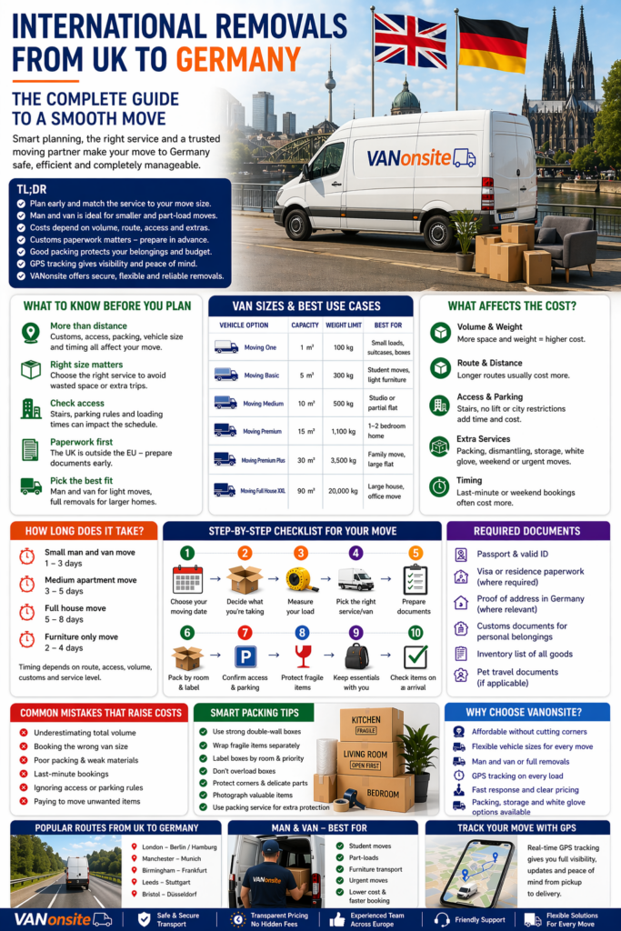 This is exactly where the right removals company can make a dramatic difference. VANonsite supports international removals from UK to Germany with secure transport, GPS tracking on every load, flexible vehicle sizes, and tailored service options for homes, offices, furniture, students, and part loads. Whether you need a compact man and van solution or a fuller removals setup, the goal stays the same: move safely, move efficiently, and protect both your time and your peace of mind.
