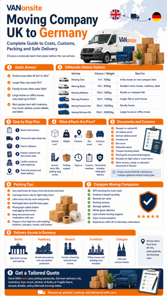 For a tailored quote, send VANonsite your pickup postcode, German delivery city, inventory, box count, photos of bulky or fragile items, access details, and preferred moving dates.
