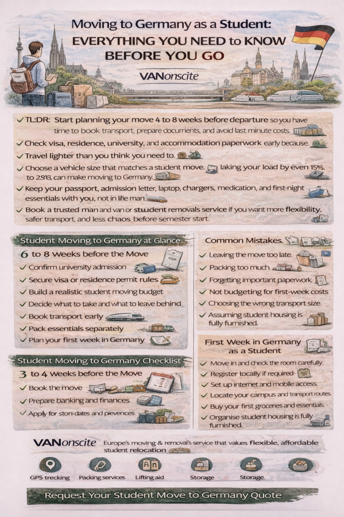 This is why moving to Germany as a student is not only about choosing a university. It is about handling two separate challenges at the same time. First, there is the academic side: admission, enrolment, housing, health insurance, and official paperwork. Then there is the real-world side: transport, packing, timing, costs, and the pressure to arrive ready before classes begin.