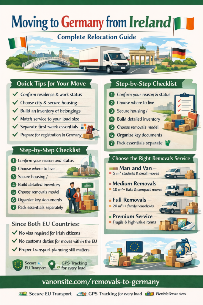 This is also where VANonsite removals to Germany fit naturally into the conversation. VANonsite offers secure European transport, GPS tracking for every load, and flexible service sizes ranging from compact man and van moves to full household relocations. That matters because not every Ireland to Germany move looks the same. A student, a family, a couple, and a remote worker may all use the same keyword, yet they are not making the same move.