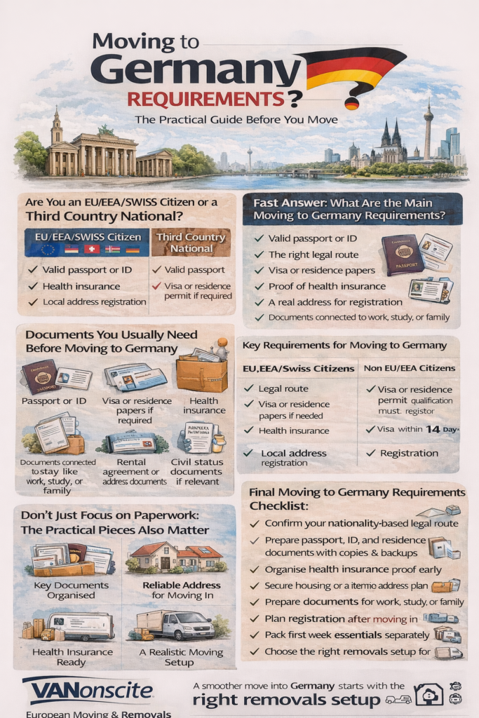 The phrase moving to Germany requirements can sound intimidating at first because it seems to describe one huge wall of bureaucracy. In reality, it becomes much easier once it is broken into the right parts: legal route, documents, health insurance, housing, registration, and a move that is planned properly from the start.