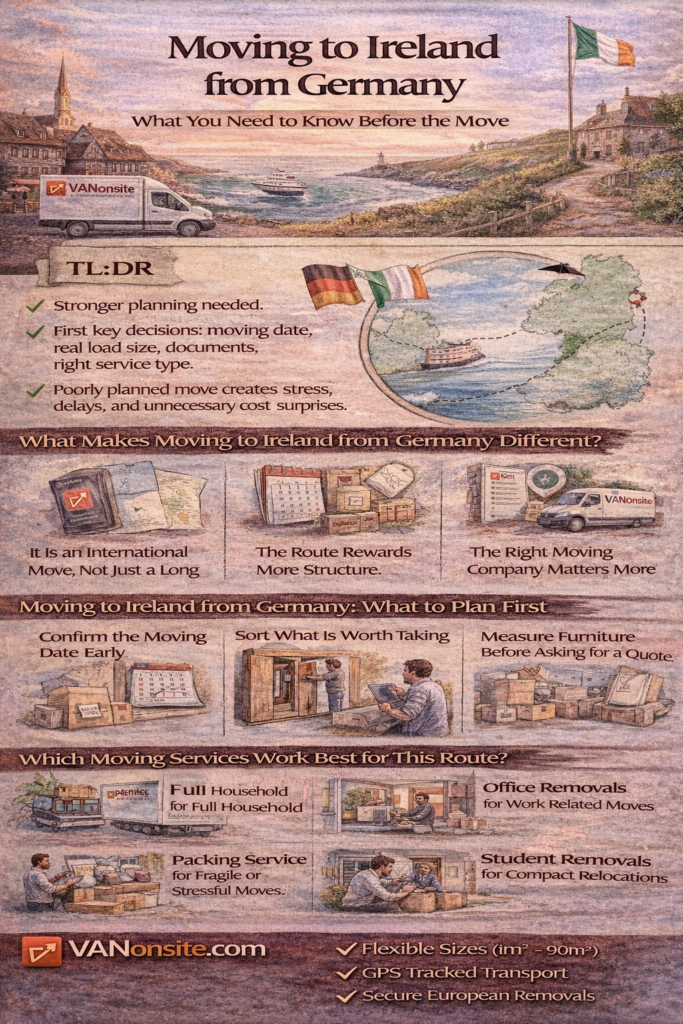 Moving to Ireland from Germany can be a smart, realistic, and surprisingly smooth relocation when the move is planned early and the logistics are handled with care. This is not a simple domestic shift from one city to another. It is a cross-border move with more moving parts, more timing pressure, and more room for avoidable stress if the planning starts too late.