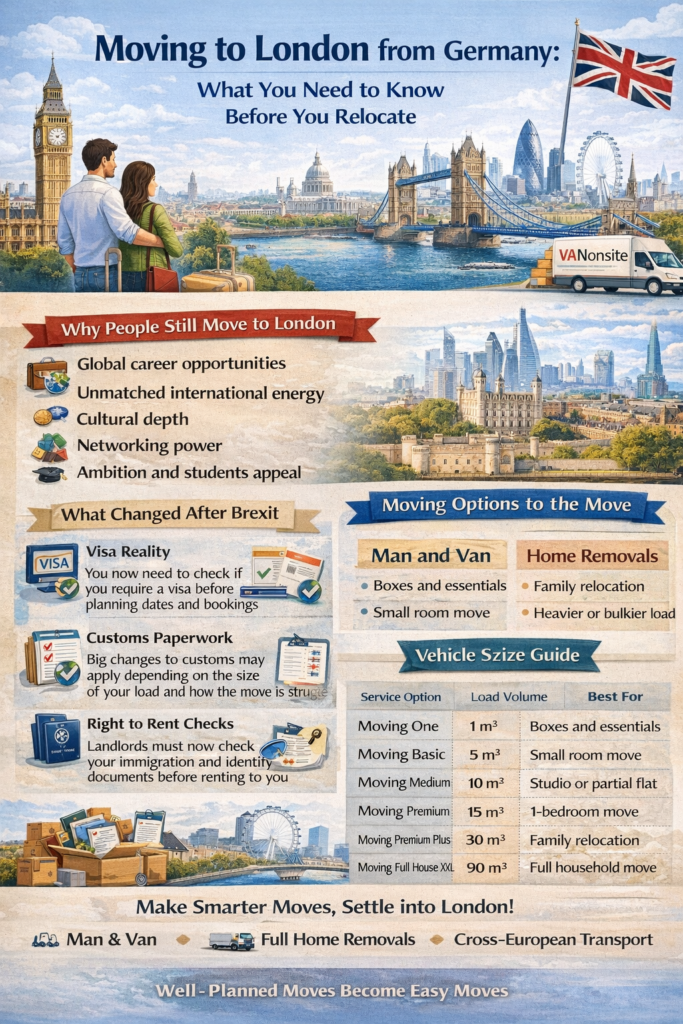 If you want the sharpest possible answer, here it is: moving to London from Germany can still be an outstanding life decision, but it now requires much more preparation than it did before Brexit. The legal route matters. The rental market matters. Customs paperwork matters. The way you move your belongings matters too.