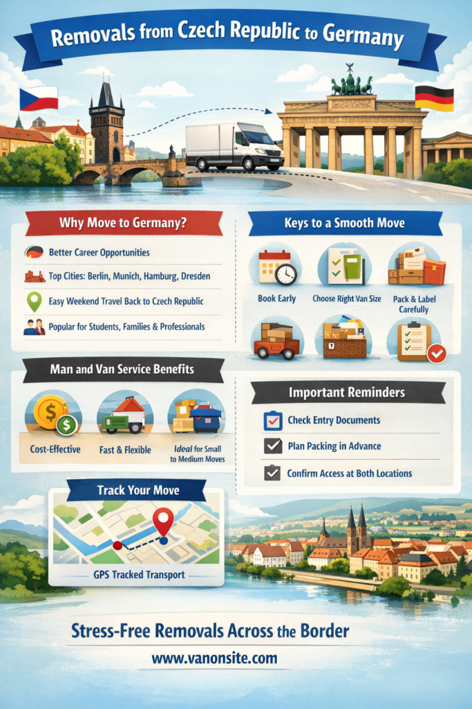 The good news is simple. A cross-border move does not have to turn into a tangle of delays, damaged furniture, and last-minute panic. With the right plan, the right vehicle size, and a dependable man and van service, the process becomes far smoother. VANonsite supports removals from Czech Republic to Germany with flexible transport options, professional handling, and GPS tracking for every load, giving customers something priceless during a move: real peace of mind.