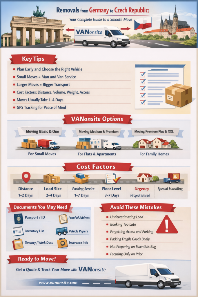 The key thing to remember is simple. Exact timing depends on route length, access at both properties, building conditions, packing quality, and the service level you choose. When the move is matched to the right plan, it feels much more controlled. With VANonsite, removals from Germany to Czech Republic can move at a pace that feels efficient, realistic, and far less stressful than many people fear.