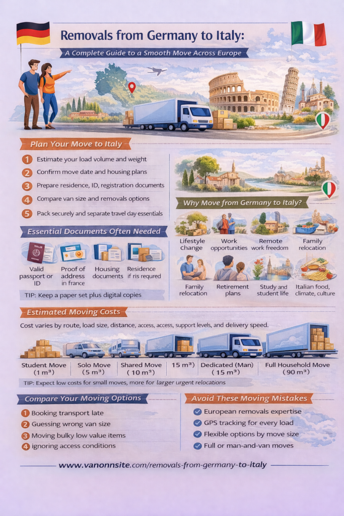 If you want safer, faster, and more organised removals from Germany to Italy, choose VANonsite and move with more confidence from the very beginning. For readers comparing options and planning the wider journey, Removals to Italy is a natural next step.