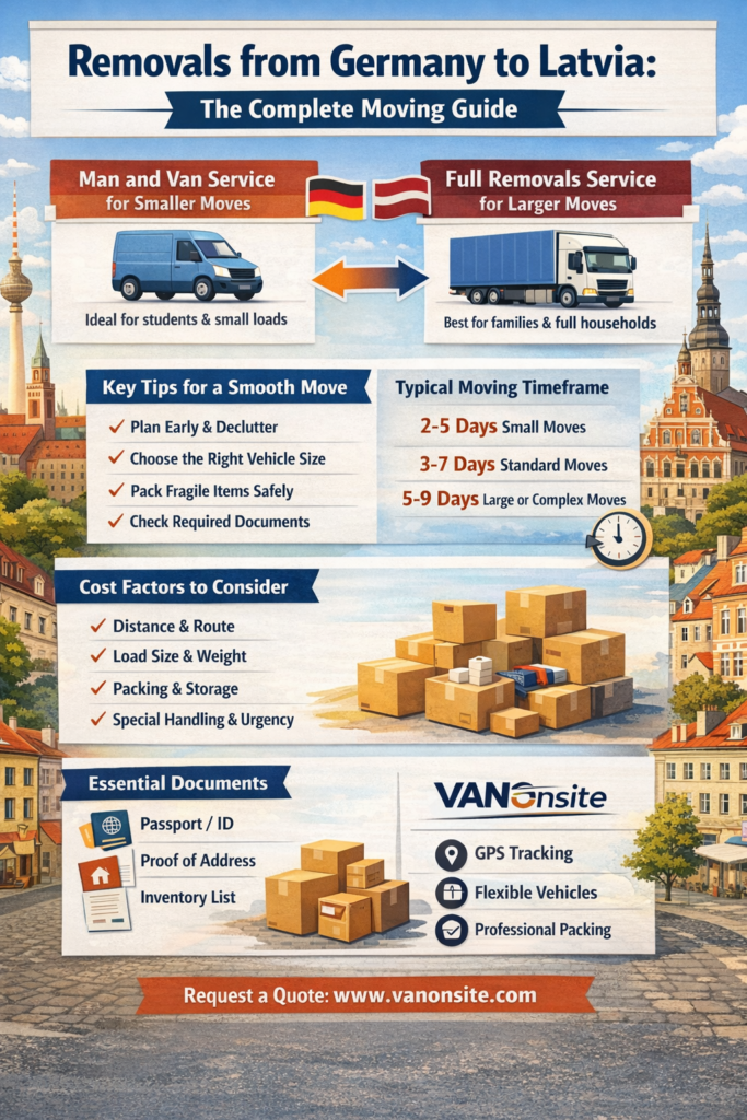 - VANonsite offers GPS tracking, flexible vehicle sizes, and tailored support that makes removals from Germany to Latvia feel more secure, visible, and easier to manage.