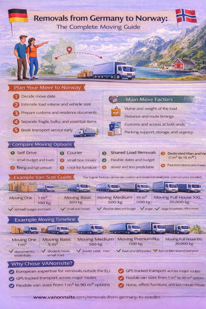 Customers planning removals from Germany to Norway often want to understand both ends of the route, not just the transport in between. That is why it can be useful to explore VANonsite’s wider service pages, including Removals to Germany and Removals to Norway.