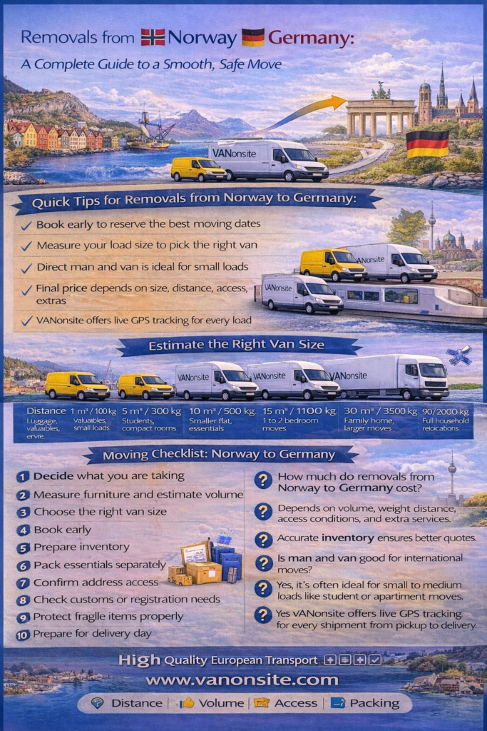 - VANonsite supports removals from Norway to Germany with reliable European transport, optional packing help, furniture removals, storage solutions, and live GPS tracking for every shipment.