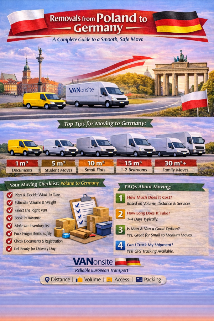 • Removals from Poland to Germany usually depend on route length, load size, access conditions, and delivery urgency.