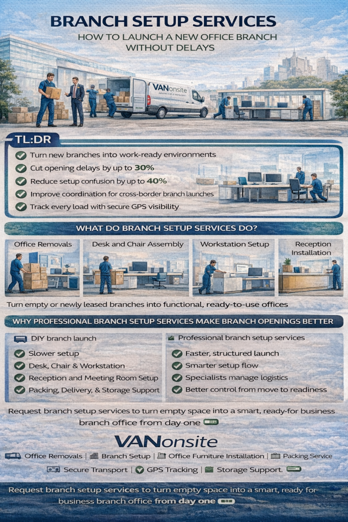 Professional branch setup services help businesses turn a new branch office into a working environment that is organised, credible, and ready for real activity from day one. Instead of treating transport, installation, storage, and workspace setup as separate headaches, they connect them into one clear process. For fast-growing companies, expanding teams, and businesses opening offices across Europe, that difference can save days of disruption and a great deal of stress.