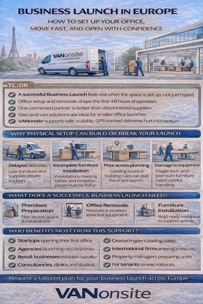 VANonsite helps businesses across Europe turn ambitious launches into organised, working spaces. Whether the project needs office removals, furniture installation, packing support, white glove handling, storage, or a fast man and van solution, the goal stays the same: open with less stress, stronger timing, and far better control.