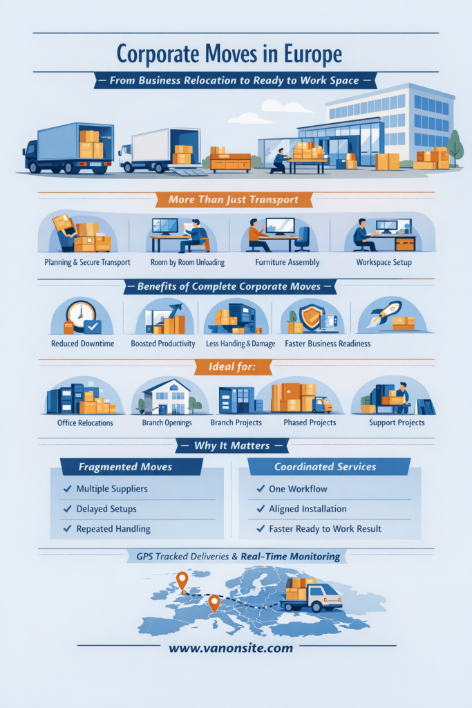 A successful corporate relocation depends on more than a vehicle and a delivery date. It depends on careful handling, dependable timing, practical sequencing, and a service model that understands how a workspace actually becomes usable. That is where VANonsite stands out. The company supports smoother corporate moves across Europe through a practical blend of speed, control, and operational flexibility that helps businesses move with far less friction.