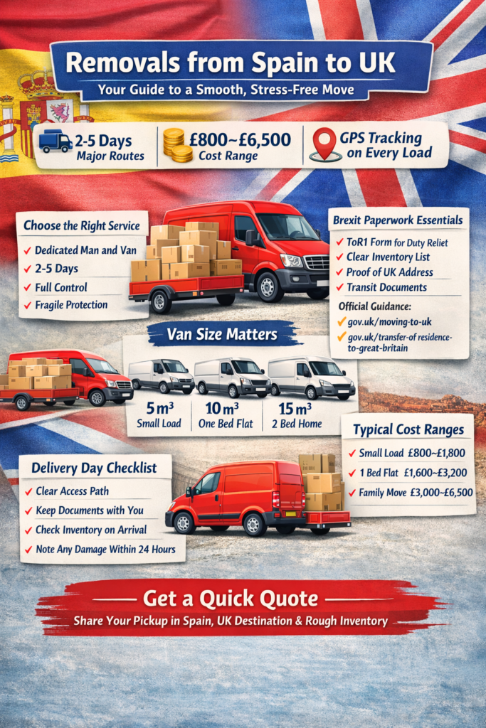 The best removals from Spain to UK are the ones that feel boring in the best way. No drama; No mystery fees; No smashed furniture; No radio silence when your life is literally on a van.
