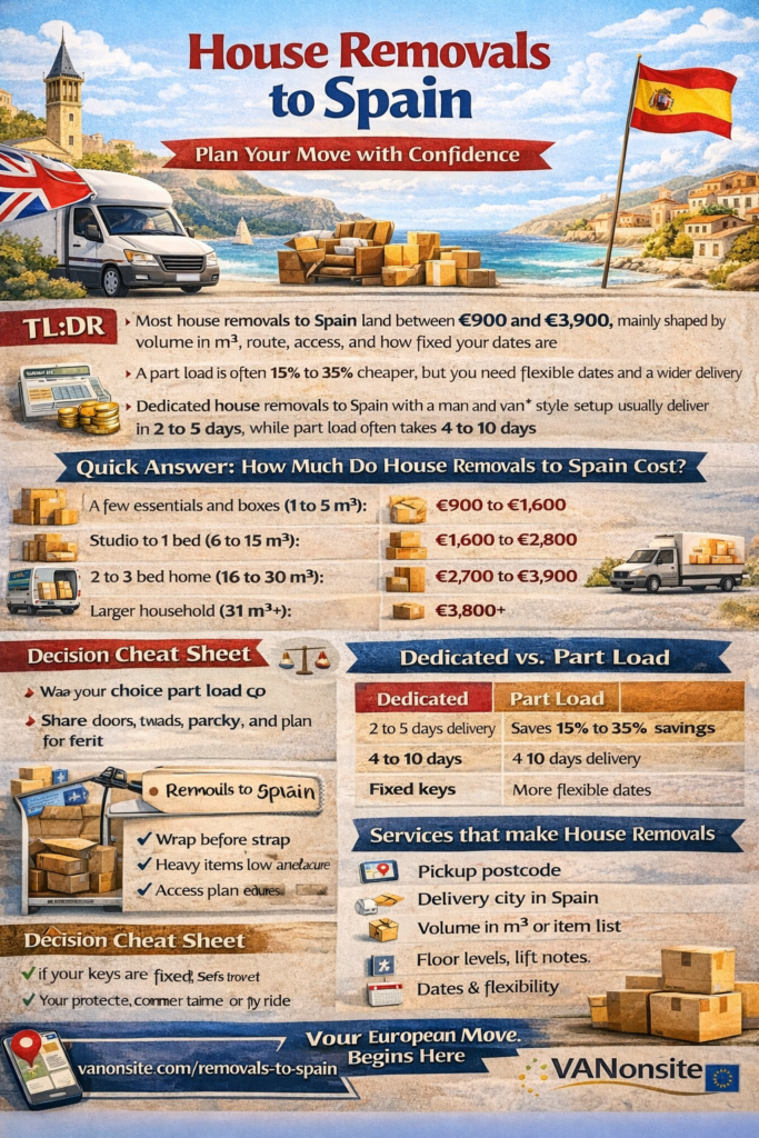 - Most house removals to Spain land between €900 and €3,900, mainly shaped by volume in m3, route, access, and how fixed your dates are