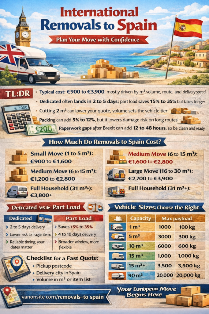 If you want a straight answer, here it is. Most international removals to Spain sit within €900 to €3,900. Your final price usually swings on three levers.