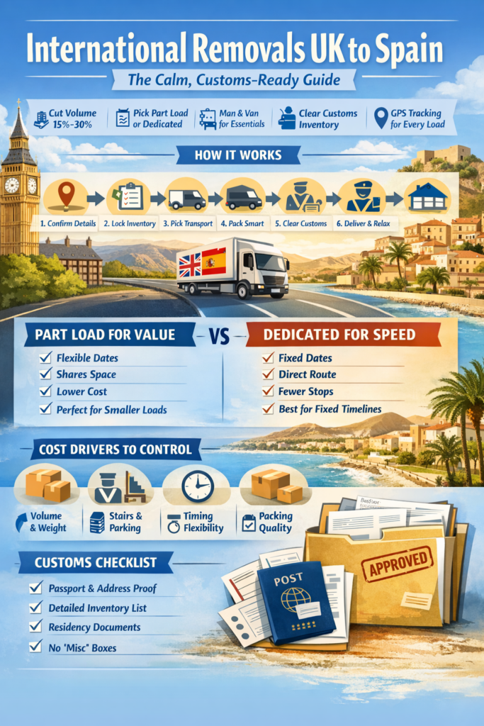 - international removals UK to Spain cost rises fastest when you underestimate volume or hide access restrictions.