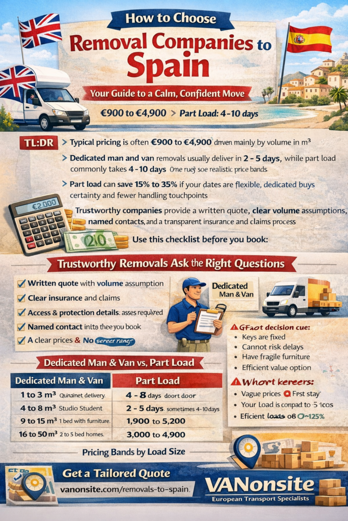 Choosing between removal companies to Spain becomes easy once you focus on what actually changes outcomes. Get a written quote with clear m3 assumptions. Decide between dedicated and part load based on your deadlines. Plan access like it matters, because it does. Keep paperwork clean, especially your itemised inventory, because missing details can add 12 to 48 hours.