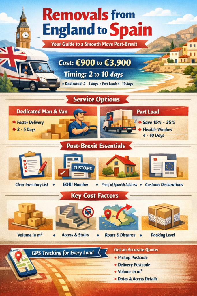 • Typical cost for removals from England to Spain is often €900 to €3,900, driven mainly by volume, route, and delivery speed